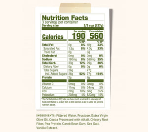 Ingredients: Wildgood Blend (Filtered Water, Extra Virgin Olive Oil), Fructose, Cocoa Processed with Alkali, Chicory Root Fiber, Pea Protein, Carob Bean Gum, Sea Salt, Vanilla Extract.