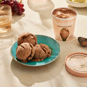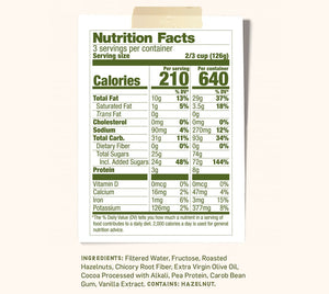 Ingredients: Wildgood Blend (Filtered Water, Extra Virgin Olive Oil), Fructose, Roasted Hazelnuts, Chicory Root Fiber, Pea Protein, Cocoa Processed with Alkali, Carob Bean Gum, Vanilla Extract.