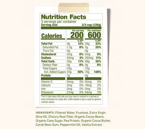 Ingredients: Wildgood Blend (Filtered Water, Extra Virgin Olive Oil), Fructose, Chicory Root Fiber, Pea Protein, Organic Cocoa Beans, Organic Cane Sugar, Carob Bean Gum, Organic Cocoa Butter, Peppermint Oil, Vanilla Extract.
