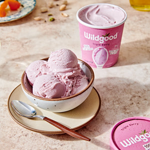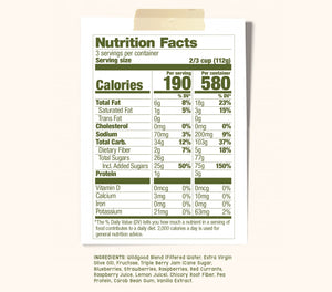 Ingredients: Wildgood Blend (Filtered Water, Extra Virgin Olive Oil), Fructose, Triple Berry Jam (Cane Sugar, Blueberries, Strawberries, Raspberries, Red Currants, Raspberry Juice, Lemon Juice), Chicory Root Fiber, Pea Protein, Carob Bean Gum, Vanilla Extract.
